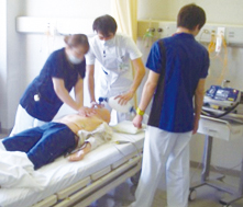 また、東京逓信病院では国が定めた研修以外にもより良い医療が提供できるように、さまざまな医療安全研修を行っています。その一部をご紹介します。1年目の研修医の注射・採血研修などの基礎的な事から急変した患者さんを再現した人形での医師・看護師の対応研修など専門的な事まで行っています。
