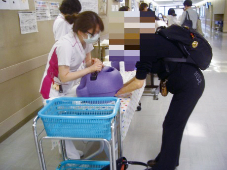 看護部は、コンサートや患者さんとの感動体験の紹介など、様々な企画で看護の日イベントを続けてきましたが、今年は少し趣向を変えて、2つの体験イベントを考えました。ひとつは、「救急蘇生体験」です。救急時初期対応の模擬訓練を見ていただき、その後、看護師とともに訓練用の人形やAEDを使用して救急蘇生の体験をします。『説明を聞いたことはあるけれど、AEDの機械を触るのは初めて』という方や、実際に公共施設などで救急蘇生の場面に遭遇したことがある方など、皆さん興味深くかつ真剣に体験してくださいました。もう一つは、「正しい手洗い体験」です。チェック用のクリームを塗ったあとに手洗いをします。その後ブラックライトに手をかざすと、洗い残しがチェックできます。きれいに洗えていた方も、思いのほか洗い残しが多かった方も、普段の手洗い方法を振り返る良い機会となり、看護師とも会話が弾んでおられました。