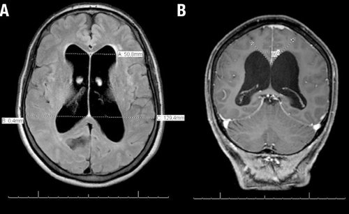 脳室の拡大が目立つ(A)が、高位円蓋部、正中部(頭頂部)は脳溝が狭小化(B)している