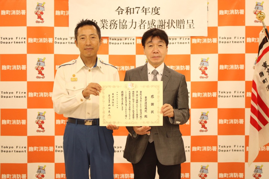 9月18日に山岨院長が麹町消防署を訪問し、山口署長から感謝状を手渡していただきました。